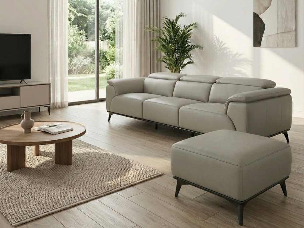 沃荷 KH-270 全牛皮功能沙發,採一字型設計搭配獨立腳椅,突破傳統框架,靈活配置不受限。頭枕可依需求自由調整,讓每位家人都能找到最舒適的角度。